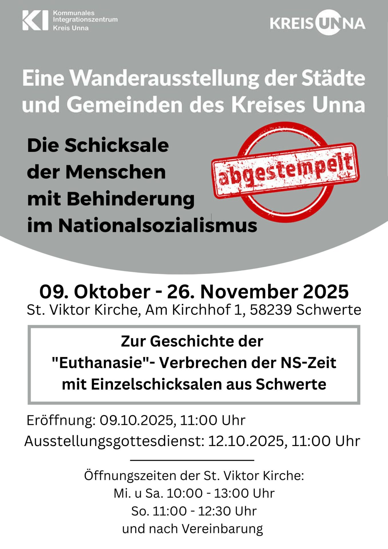 Im Kreis Unna hat es sich eine Gruppe zur Aufgabe gemacht, auf die Geschichte der „Euthanasie“-Verbrechen im heutigen Kreisgebiet in Form einer Wanderausstellung aufmerksam zu machen. Unter dem Titel „Abgestempelt“ werden auf eigens gestalteten Bannern die allgemeinen Hintergründe und Verfahrensweisen der „Euthanasie“ erläutert. Daran anknüpfend werden exemplarische Lebensgeschichten und Einzelschicksale von benannten Opfern aus den Kommunen des Kreises Unna vorgestellt. Am Donnerstag, 9. Oktober, um 11 Uhr wird die Wanderausstellung in der St. Viktor-Kirche offiziell eröffnet. Nach kurzen Eröffnungsreden ist die Gelegenheit an einer Führung durch die Ausstellung teilzunehmen. Hier wird um eine kurze Anmeldung gebeten. Für Sonntag, 12. Oktober, um 11 Uhr wird in die St. Viktor-Kirche zum Ausstellungsgottesdienst einladen. Hiernach wird es die Möglichkeit geben von Ulrich Reitinger durch die Ausstellung geführt zu werden.