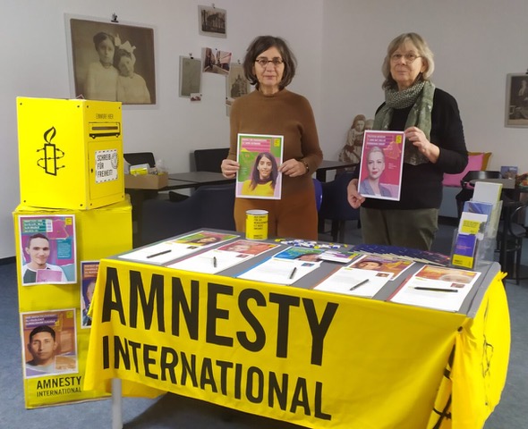 Wie Menschenrechtsarbeit lokal aussehen kann, wird anhand von Berichten über Aktivitäten und Aktionen hier vor Ort gezeigt. Das Foto zeigt die beiden Referentinnen in der Stadtbücherei. Der Eintritt ist frei!