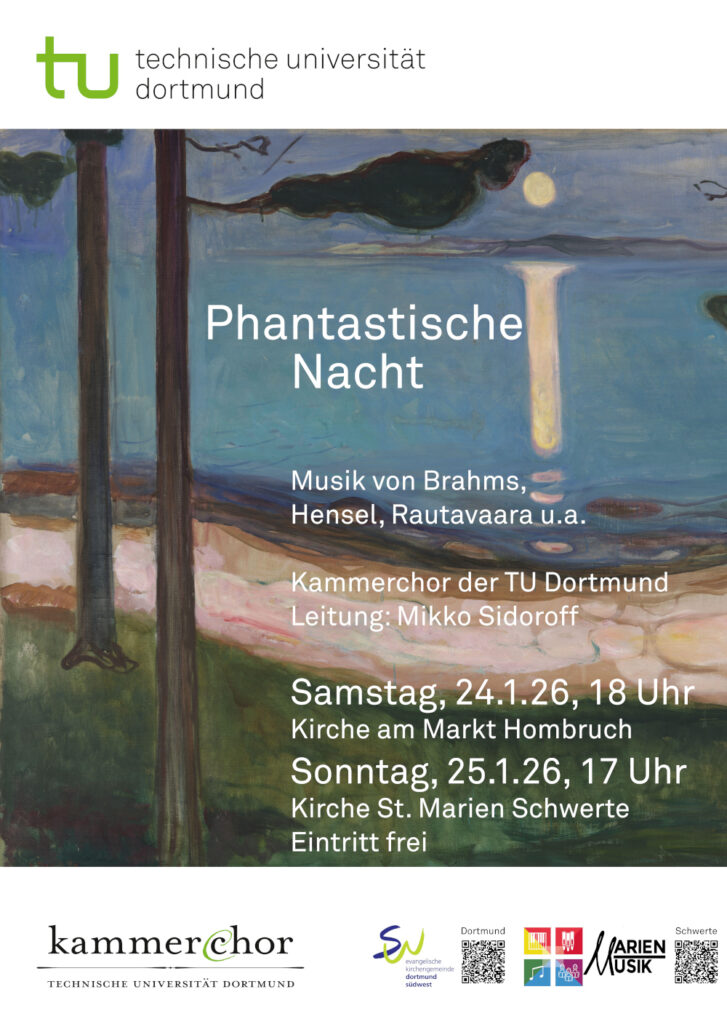 Gerade im Kulturbereich lohnt es sich Termine weit im Voraus zu notieren: Am 25. Januar 2026 um 17 Uhr präsentiert der Kammerchor der Technischen Universität Dortmund unter der Leitung von Mikko Sidoroff das a capella-Programm „Phantastische Nacht“. Das Konzert führt durch Klanglandschaften des Nordens und der Romantik.