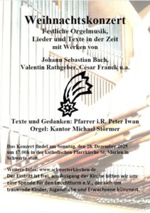 Die Mariengemeinde lädt wieder herzlich zum diesjährigen Weihnachtskonzert ein. Zu hören sind weihnachtliche Orgelmusik, Lieder und Texte „in der Zeit“. Orgelwerke von Johann Sebastian Bach, Valentin Rathgeber, César Franck und weiteren interessanten Komponisten sollen die Möglichkeit bieten, ganz gegen den allgemeinen Trend, in der Weihnachtszeit selbst den tiefen Gedanken von Weihnachten noch einmal nachklingen zu lassen.