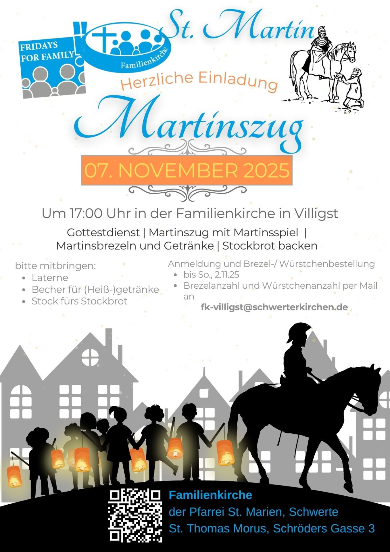 Am Freitag, 07.11.2025 um 17.00 Uhr laden wir in die FamilienKirche (Schröders Gasse 3, Villigst) zum Martinsgottesdienst mit anschließendem Martinszug ein.