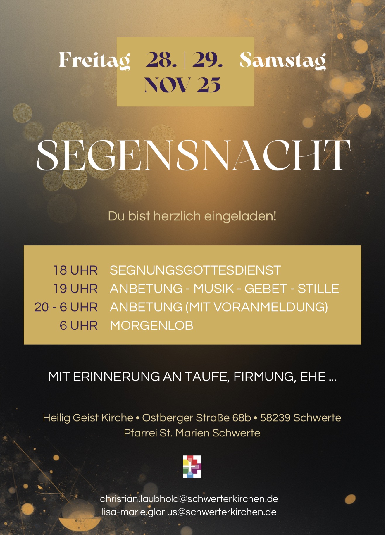 In der Nacht von Freitag, 28. November, auf Samstag, 29. November, bietet die Pfarrei in der Heilig-Geist-Kirche an der Ostberger Straße eine Segensnacht an. Thema wird die Erinnerung an die Taufe, an die Firmung, an das Eheversprechen und andere Segens-„Ereignisse“ im Leben sein. Die Heilig Geist-Kirche wird zum Jahreswechsel geschlossen, deshalb sind vor allem Gemeindemitglieder eingeladen, die eben diese Segens-Ereignisse und Erlebnisse mit der Heilig Geist-Kirche verbinden. Darüber hinaus können und sollen aber auch Gemeindemitglieder aus der Gesamtpfarrei, also aus allen Pfarrbezirken, sowie interessierte Menschen dazukommen. Die Nacht beginnt um 18 Uhr mit einem Segnungsgottesdienst mit Pastor Christian Laubhold und Gemeindeassistentin Lisa-Marie Glorius. Ab 19 Uhr beginnt die stille Anbetung mit Musik und Gebeten. Von 20 Uhr bis 6 Uhr in der Frühe kann in der Kirche gebetet und gewacht werden, wer das möchte, sollte sich an dem Abend dann melden oder zuvor eine Mail schreiben an christian.laubhold@schwerterkirchen.de. Um 6 Uhr beginnt das Morgenlob in Heilig Geist.