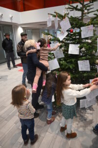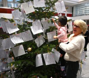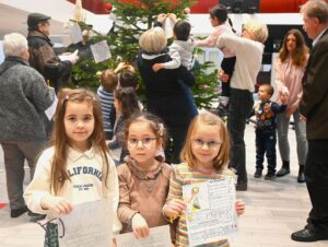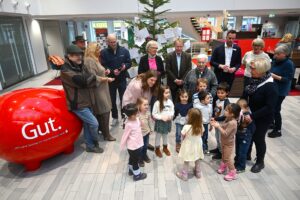 Neben der Sparkasse Dortmund mit Filialleiterin Michaela Hacheney und Mitarbeiter Alexander Staklies helfen in diesem Jahr auch wieder der Rotary Club und der Lions Club Caelestia finanziell bei der Aktion. Rotary-Club-Präsident Dr. Alfons Drüke und Schatzmeister Dr. Richard Saure sowie die Caelestina-Präsidentin Maria Büse-Dallmann beobachteten die emsigen Kita-Kinder erst amüsiert, dann mussten sie als „Kinder-Kran“ auch Wunschzettel an die Baumspitzen ganz oben anbringen helfen.