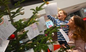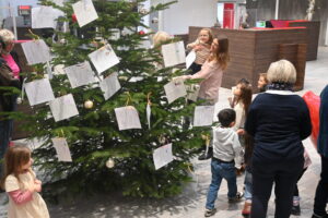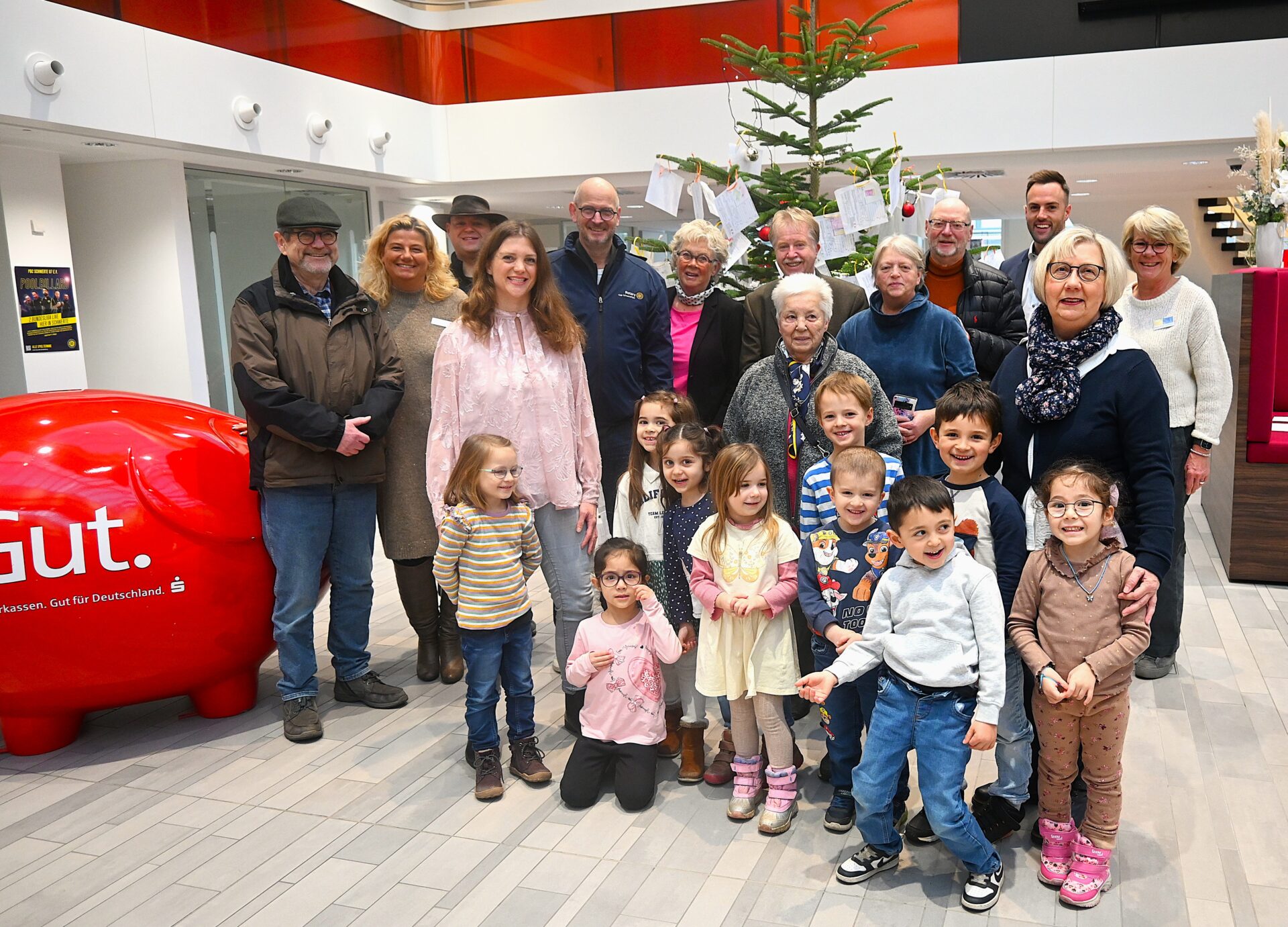 Ob die Erwachsenen aufgeregter waren als die Kinder? Immerhin galt es den traditionellen Wunschbaum in der Hauptstelle der Sparkasse zu schmücken. Die Kleinen aus der katholischen Kita Arche Noah jedenfalls erledigten ihren Job sehr routiniert, sie wussten, was sie taten. „Das sind Wunschzettel von armen Kindern“. 289 Wunschzettel, um genau zu sein. Vom Baum sieht man nicht mehr viel.