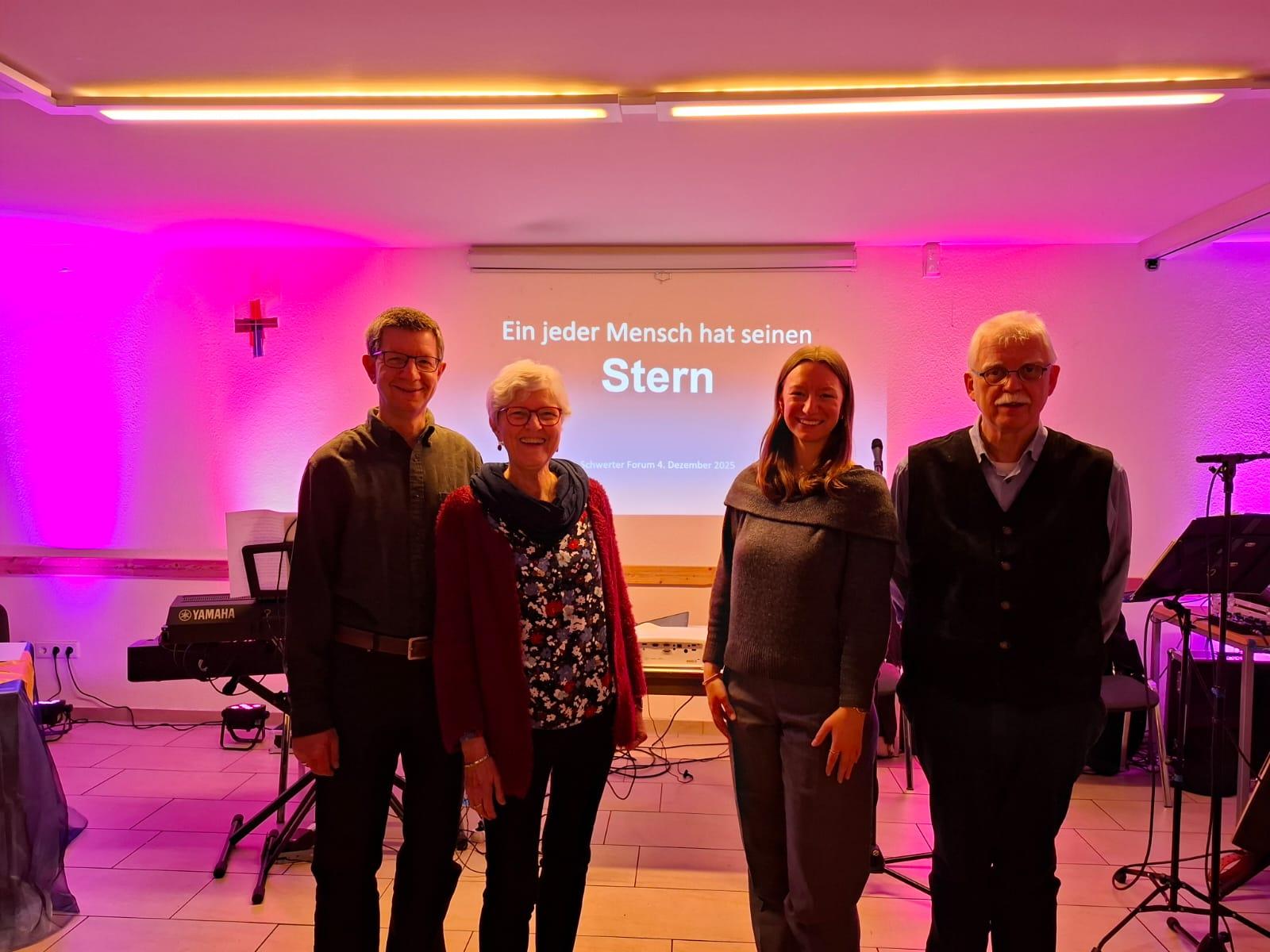 Mariele Rupieper begrüßte am Donnerstag, 4. Dezember 2025 die Gäste an den adventlich geschmückten Tischgruppen zu einem stimmungsvollen Abend zusammen mit der Musikgruppe PADUANA: Stefan Kopetz am E-Piano, Hardy Krüger an der Gitarre und als Sängerin Sarah Kopetz. Bei Tee, Kaltgetränken, Gebäck und Kerzenschein konnten alle, die kamen, die Sorgen des Alltags vergessen und in die verschiedenen Dimensionen der Sternenwelt eintauchen.