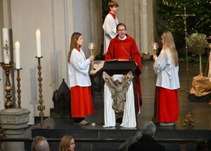 Pastor Christian Laubhold und Pfarrer Guido Bartels als Konzelebrant feierten den liturgischen Teil dieser Messe, die die fantastische Akustik des Kirchengebäudes an der Goethestraße voll zur Geltung brachte. Kirchenmusiker Andreas Feilen musste zwischendurch vom Dirigat vor dem Altar immer wieder zur Empore hinauf sprinten, wo er die Messe an der großen Seiffert-Orgel mit ganzem Einsatz begleitete.