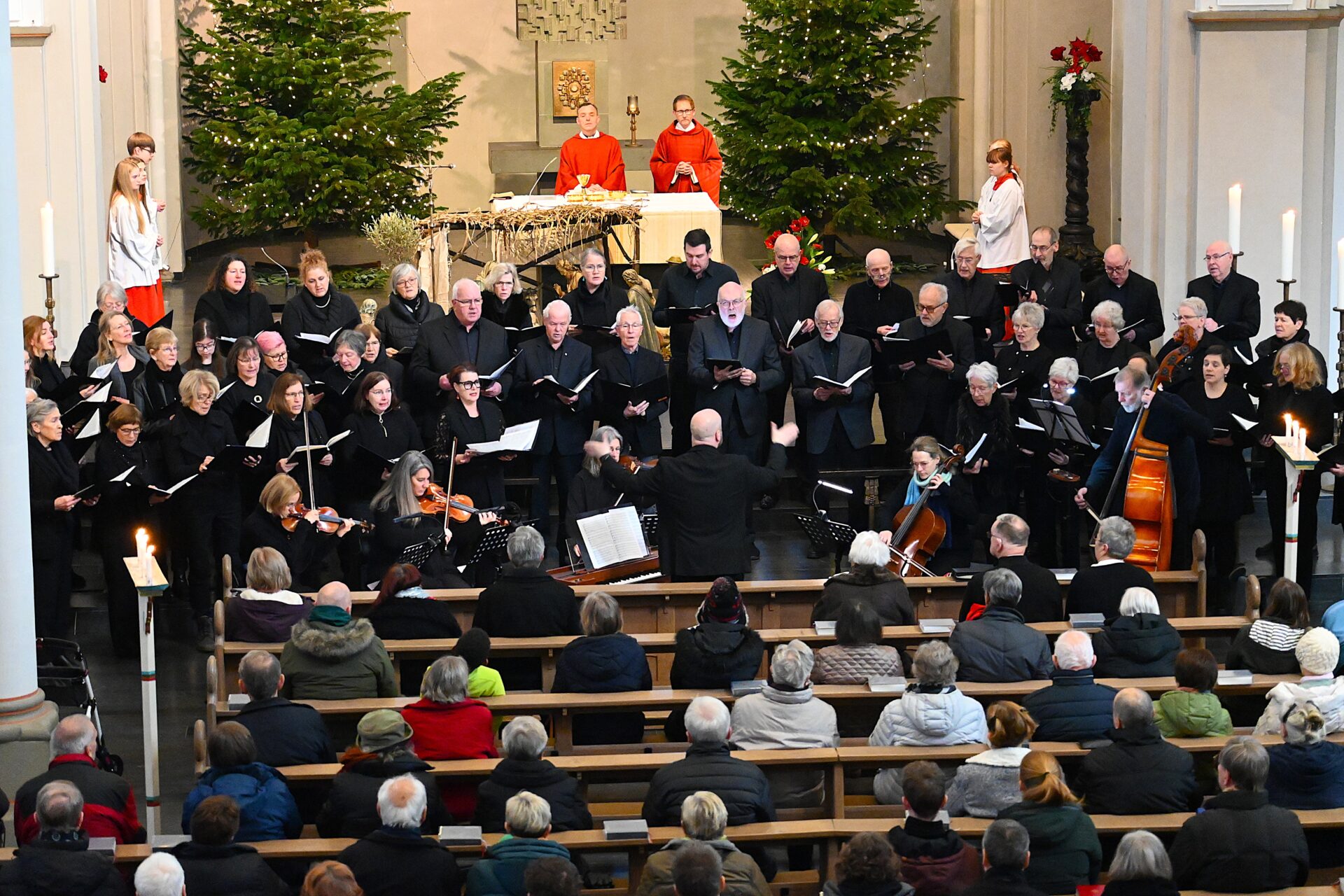 Ein kirchenmusikalisches Ereignis, das rund 300 Gottesdienstbesucher am zweiten Weihnachtstag in der Heiligen Messe in St. Marien gemeinsam erlebten und feierten: Unter der musikalischen Leitung von Dr. Andreas Feilen sang ein 60köpfiger Projektchor, unterstützt von fünf professionellen Streichern (zwei Violinen, Viola, Cello, Bass), die 1877 geschriebene Messe brève no. 7 des französischen Opern- und Kirchenmusik-Komponisten Charles Gounod.