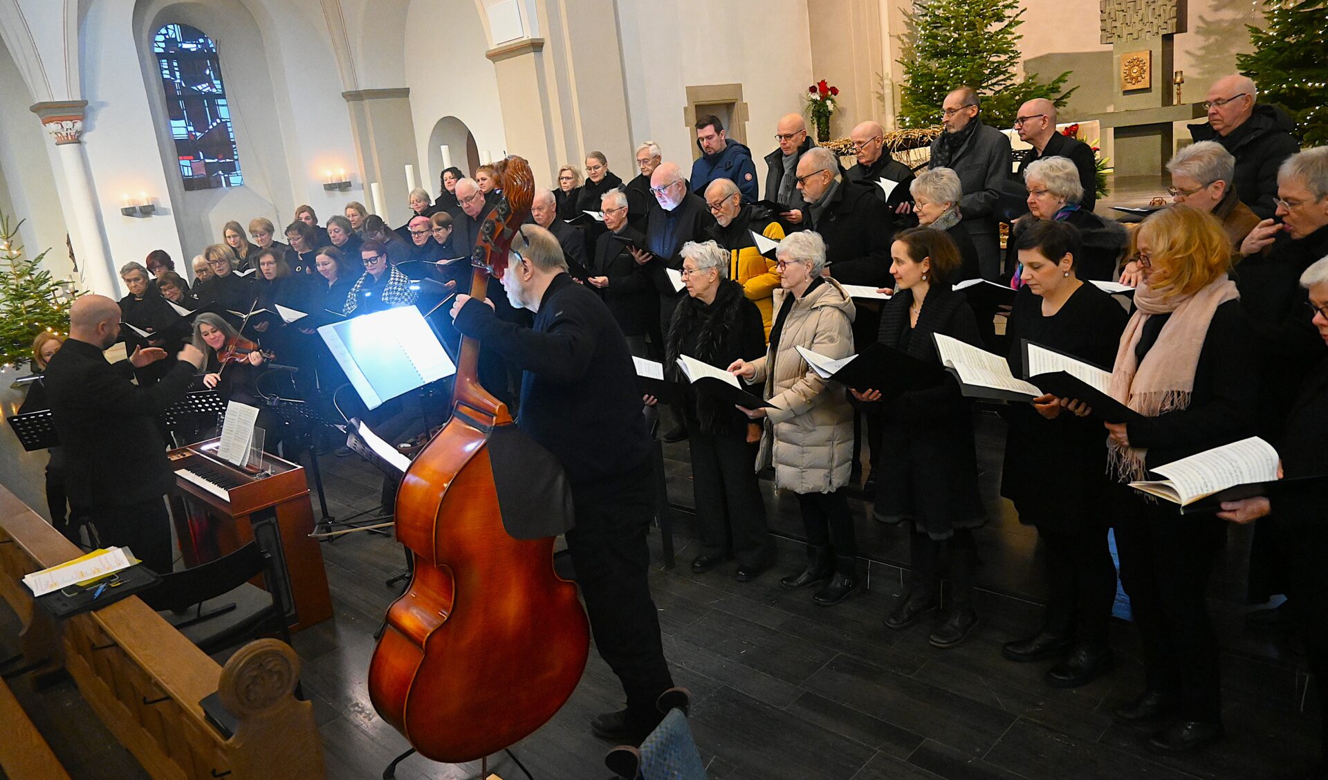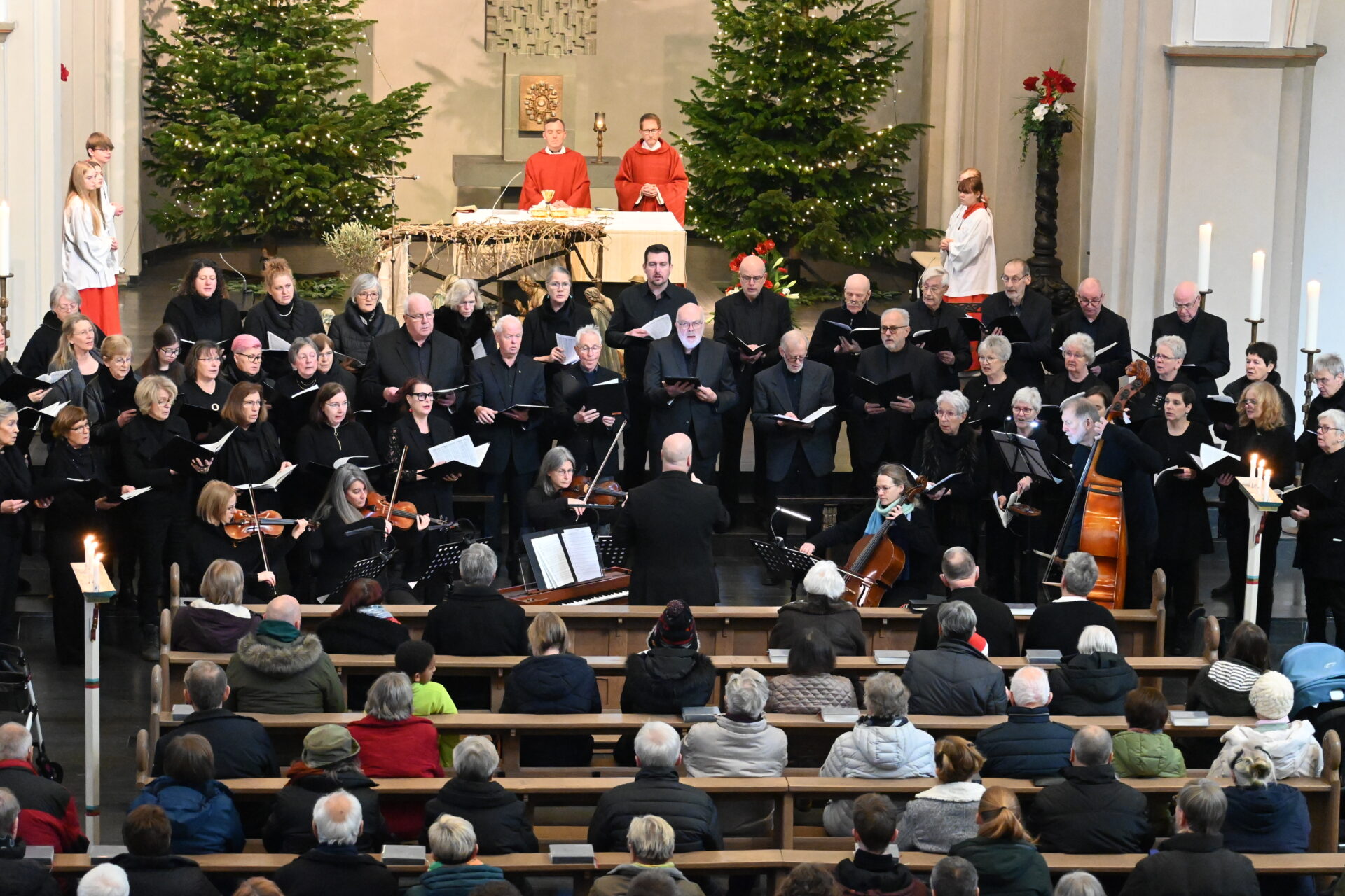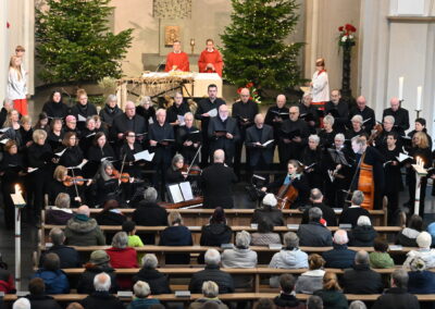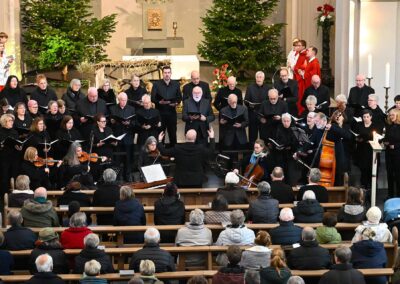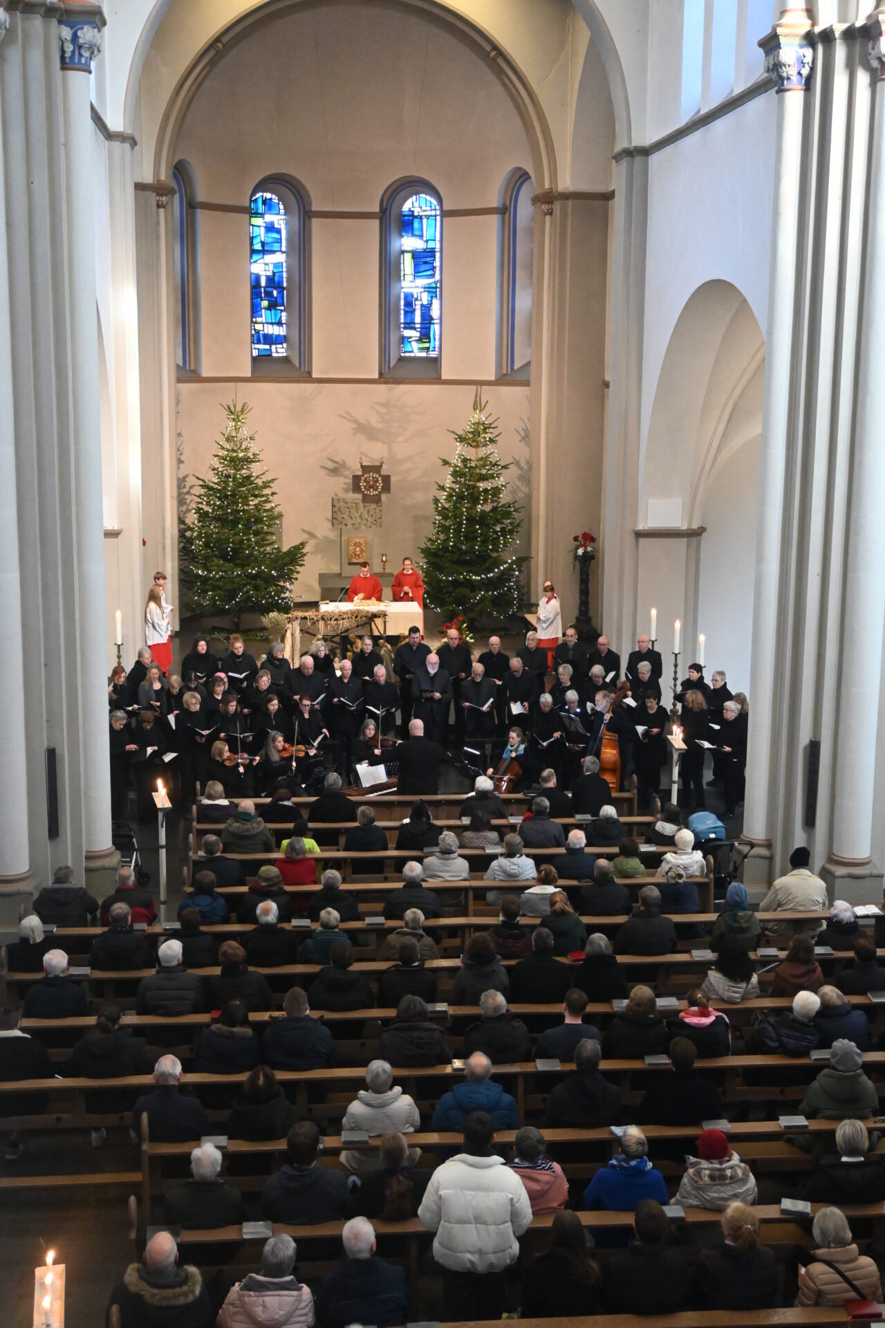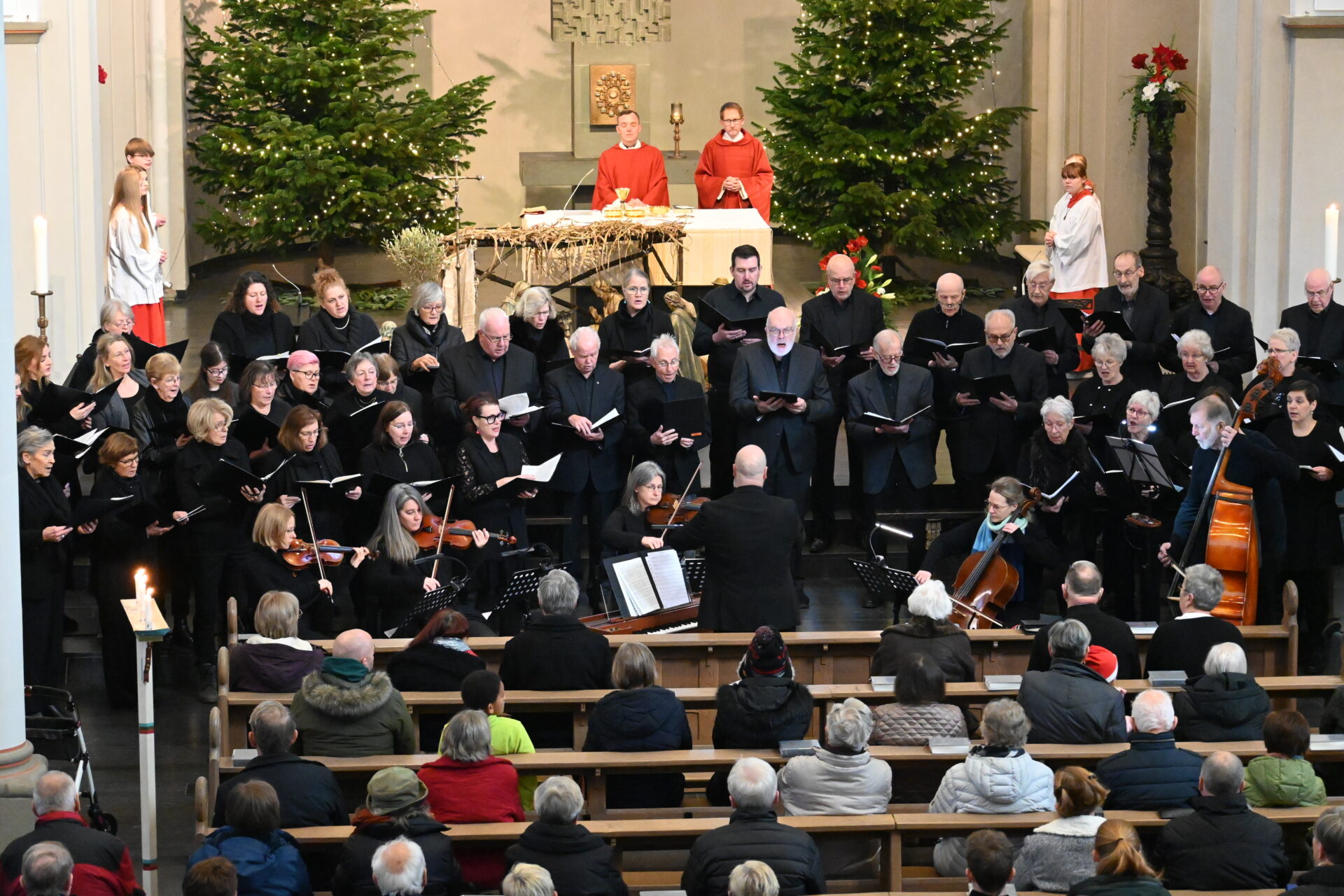 Ein kirchenmusikalisches Ereignis, das rund 300 Gottesdienstbesucher am zweiten Weihnachtstag in der Heiligen Messe in St. Marien gemeinsam erlebten und feierten: Unter der musikalischen Leitung von Dr. Andreas Feilen sang ein 60köpfiger Projektchor, unterstützt von fünf professionellen Streichern (zwei Violinen, Viola, Cello, Bass), die 1877 geschriebene Messe brève no. 7 des französischen Opern- und Kirchenmusik-Komponisten Charles Gounod.
