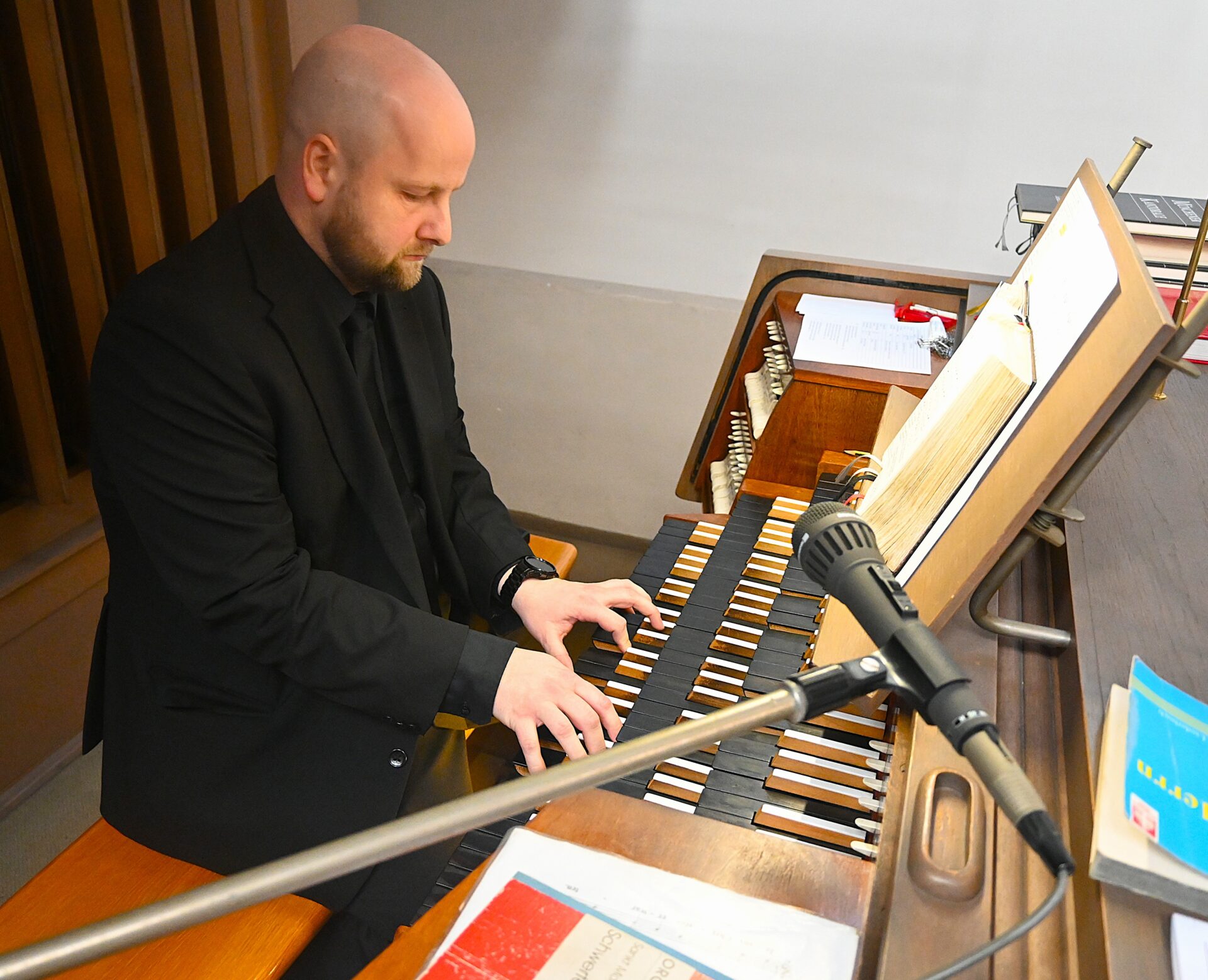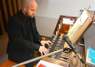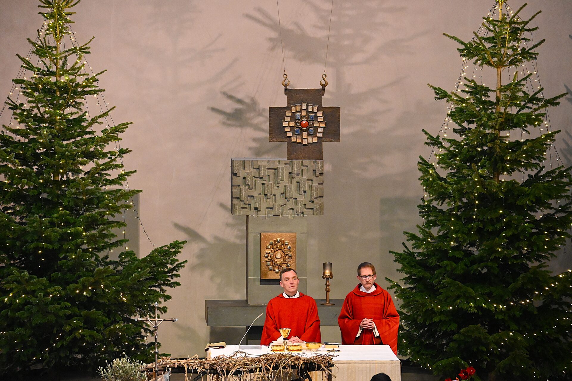 Pastor Christian Laubhold und Pfarrer Guido Bartels als Konzelebrant feierten den liturgischen Teil dieser Messe, die die fantastische Akustik des Kirchengebäudes an der Goethestraße voll zur Geltung brachte. Kirchenmusiker Andreas Feilen musste zwischendurch vom Dirigat vor dem Altar immer wieder zur Empore hinauf sprinten, wo er die Messe an der großen Seiffert-Orgel mit ganzem Einsatz begleitete.
