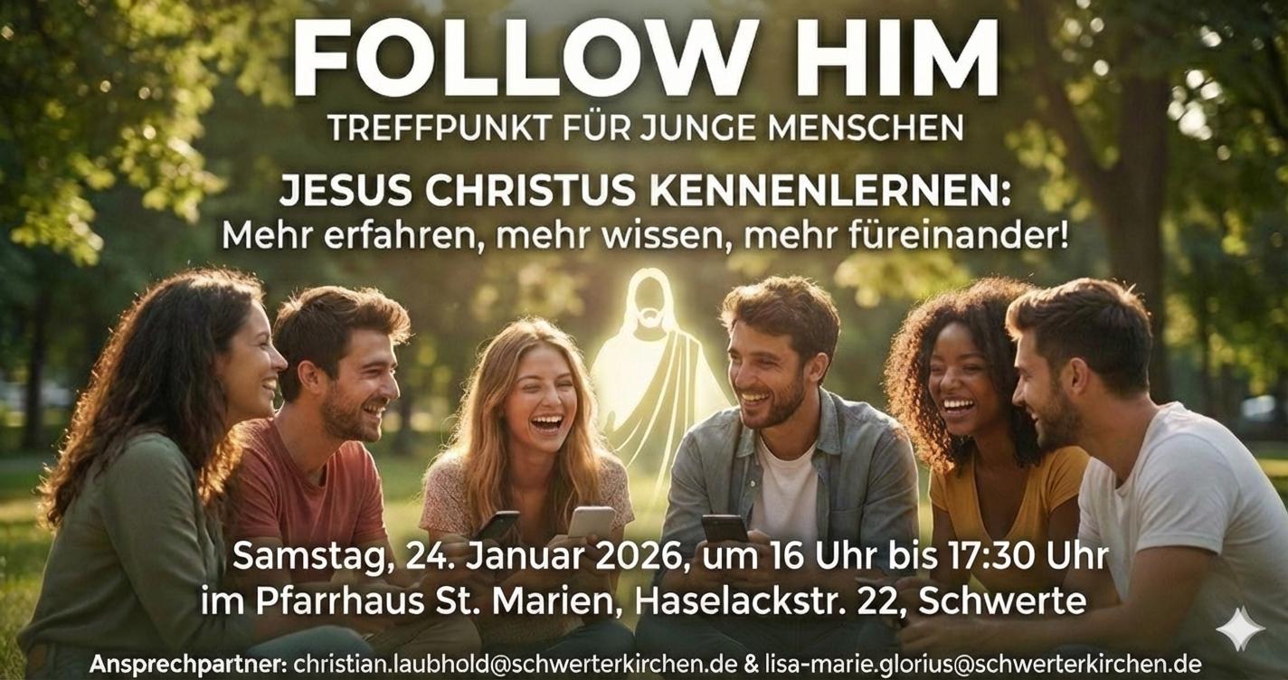 Herzlich laden wir ein zum Treffpunkt für junge Erwachsene: Follow-him. Am Samstag, 24. Januar, 16 bis 17:30 Uhr, im Pfarrhaus St. Marien. Darum geht es: mehr über den christlichen Glauben erfahren, mehr über sich selbst erfahren, Jesus Christus im Gebet mehr kennenlernen und mehr Gemeinschaft untereinander erleben. Das alles in einer entspannten Atmosphäre. Ein herzliches Willkommen.