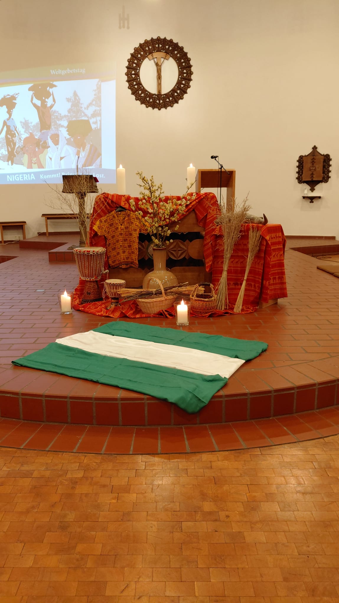 Am vergangenen Freitag haben wir mit ca. 25 Frauen und Männern in St. Christophorus den Weltgebetstag gefeiert. Gastgeberland war in diesem Jahr Nigeria. Eindrucksvoll haben wir von einem Land erfahren, in dem vielfach Angst und Gewalt vorherrschen, aber auch von Menschen, die sich diesem Leben mit viel Engegament stellen. Das Titelbild wurde erläutert und die drei ausgewählten Frauen rückten mit ihren Geschichten in den Mittelpunkt des Gottesdienstes. Ein besonderer Dank gilt Claudia und Arne Büssing. Sie haben mit ihrer Musik und ihrem Liedvortrag sehr zum Gelingen des Gottesdienstes beigetragen. Am Ende konnte wir Spenden in Höhe von 120 € auf das Konto des Weltgebetstages überweisen. Das anschließende Zusammensein im Gemeindehaus rundete den Abend ab. Wir freuen uns im nächsten Jahr auf das 100-jährige Jubiläum des Weltgebetstags.