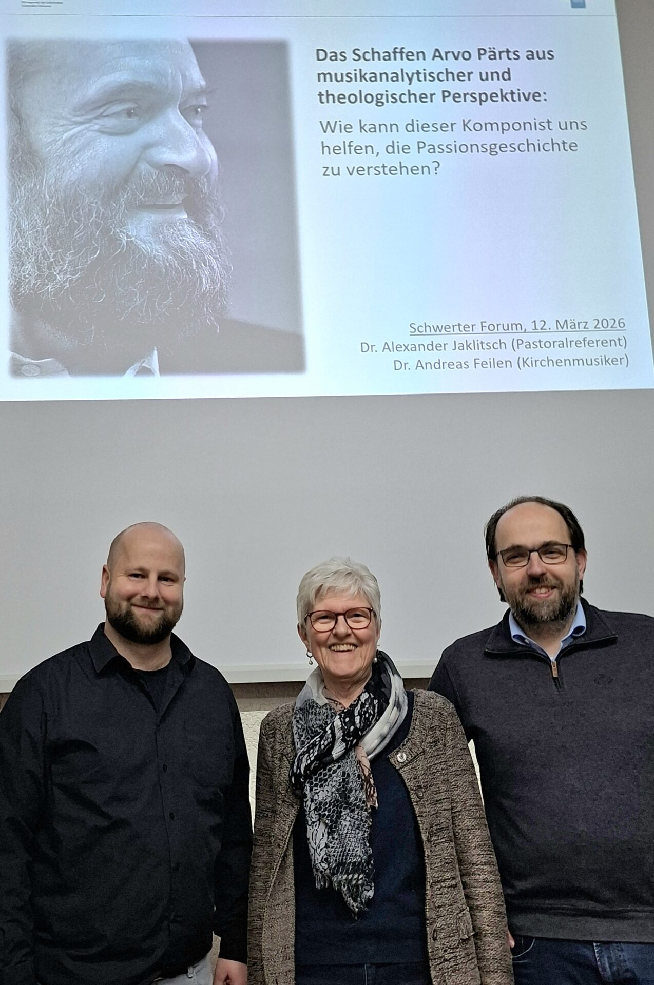 Das vor 36 Jahren als „Bildungswerk der Katholischen Gemeinden“ gegründete SCHWERTER FORUM feierte seinen neuen Anfang im Bürgersaal des Rathauses. Die erste Veranstaltung im Jahr 2026 war eine gelungene Hommage an den zeitgenössischen Komponisten Arvo Pärt und die Deutung seines Musikwerks auch im Blick auf die Passionsgeschichte.