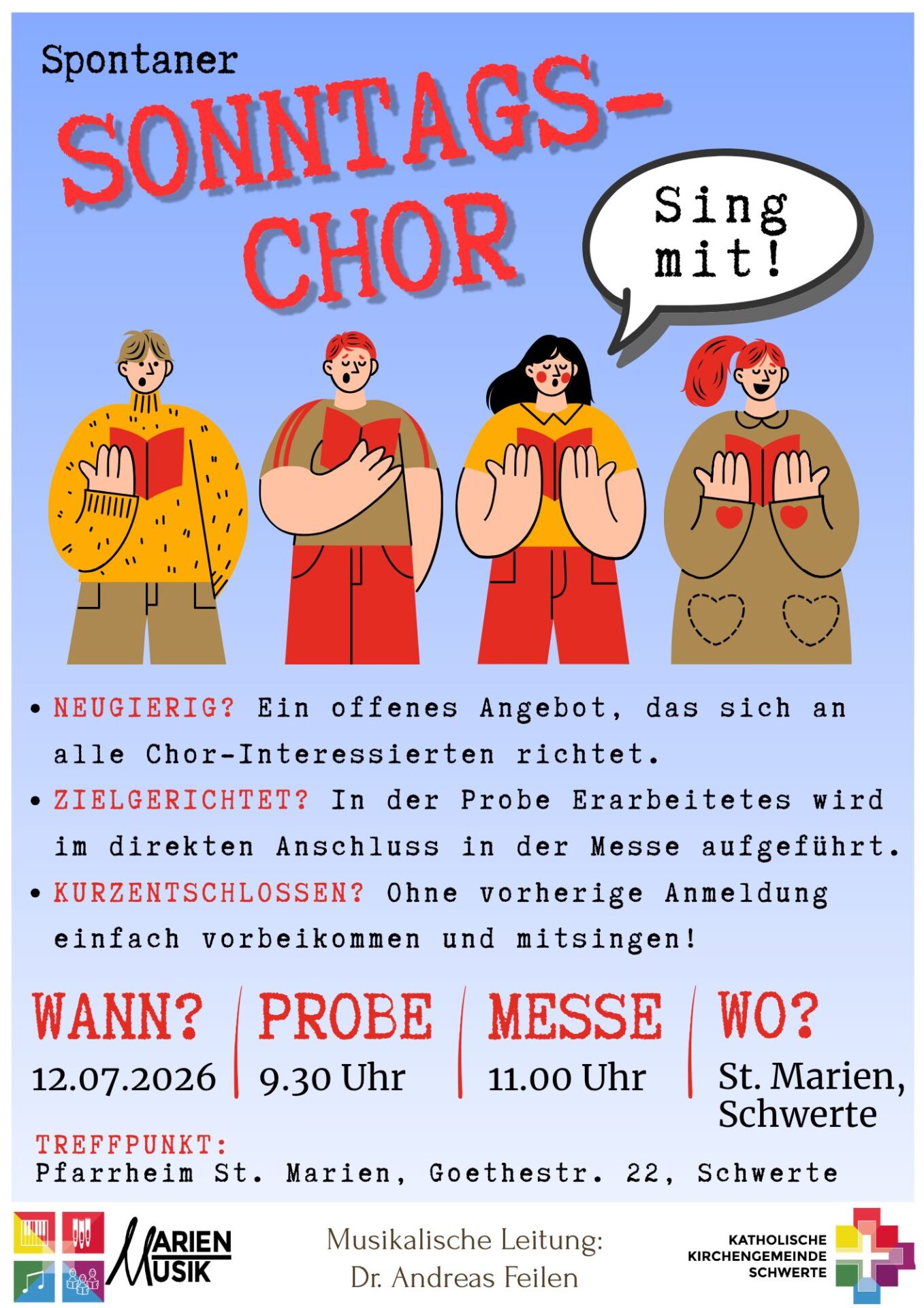 Herzliche Einladung zu dem neuen musikalischen Angebot „SONNTAGS-CHOR“. Alle spontanen und interessierten Sängerinnen und Sänger sind eingeladen, ohne vorherige Anmeldung kurzentschlossen vorbeizukommen und mitzusingen. In der Probe erarbeitete Chorlieder werden im direkten Anschluss im Rahmen der Heiligen Messe in der Marien-Kirche präsentiert.