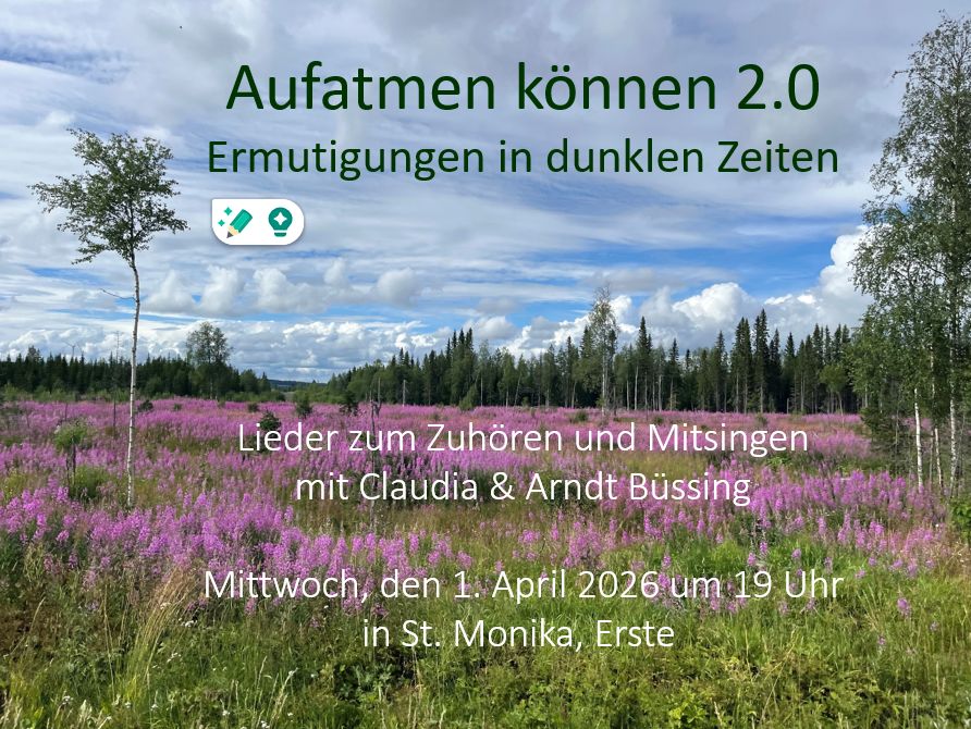 Am Mittwoch der Karwoche, 1. April um 18.00 Uhr, laden Claudia und Arndt Büssing unter dem Titel „Aufatmen können“ in die Kirche St. Monika in Ergste ein. Als vorösterliche Ermutigung in dunklen Zeiten erwarten die Teilnehmenden Lieder zum Zuhören und Mitsingen.
