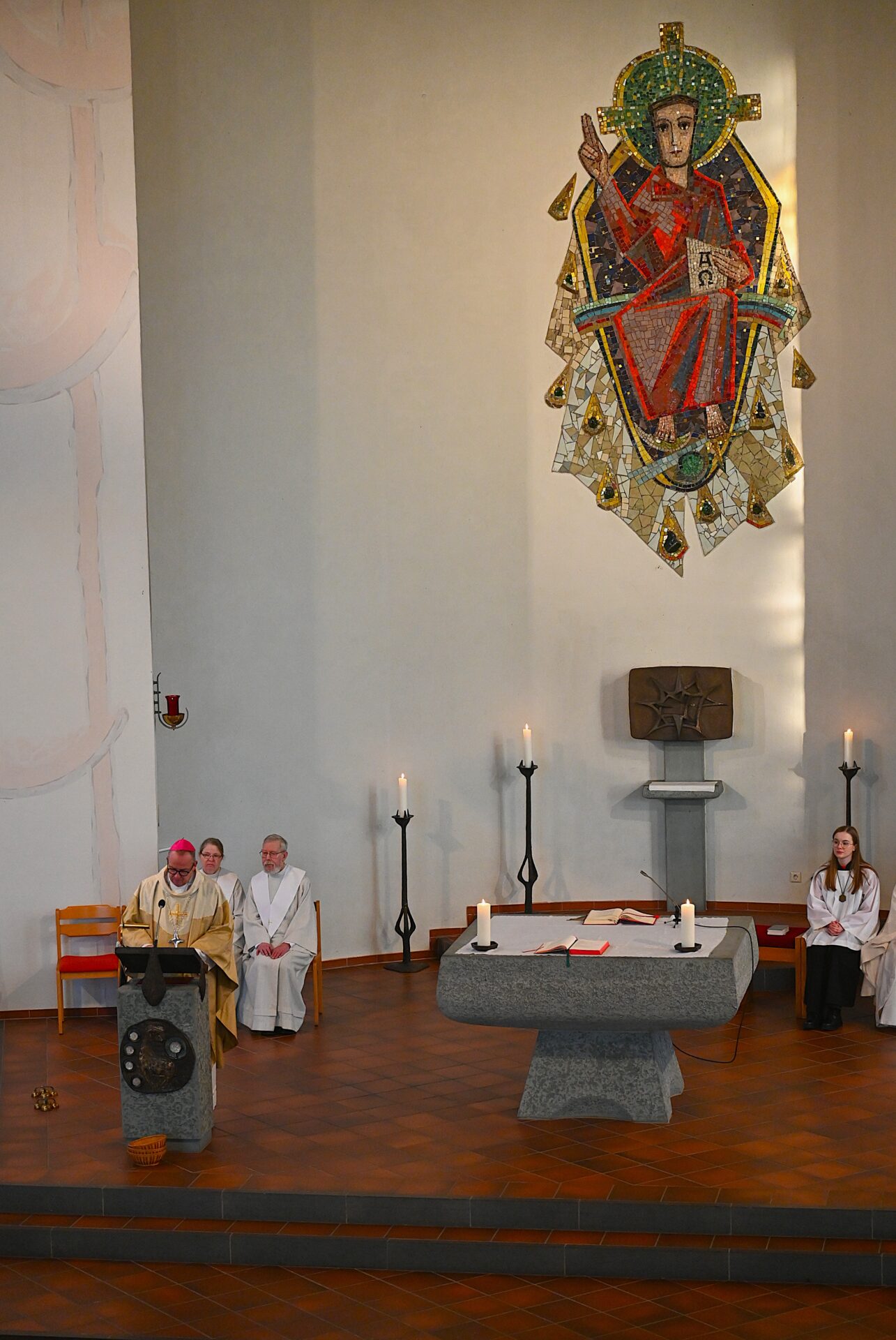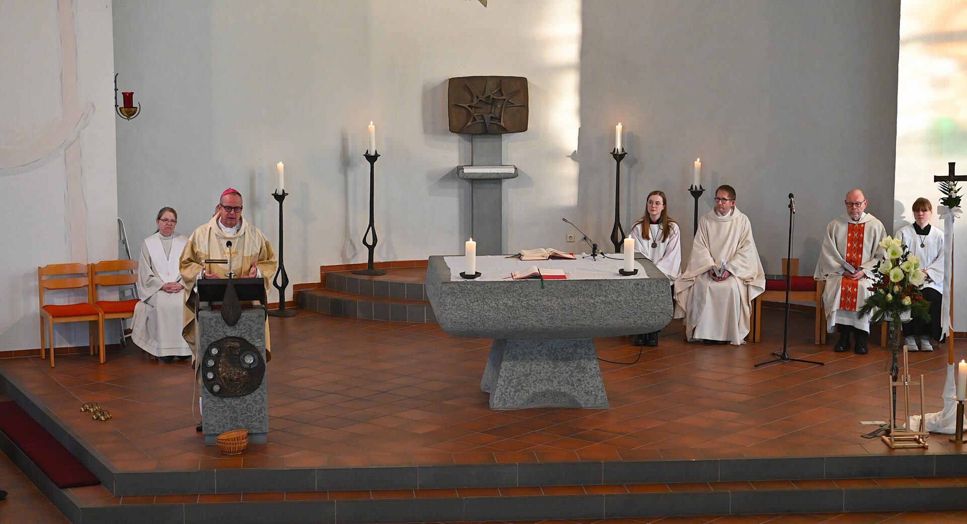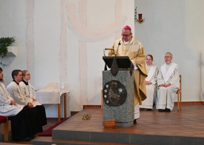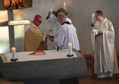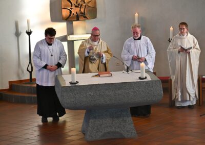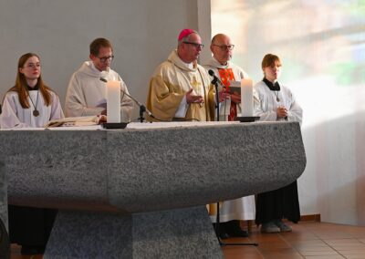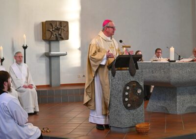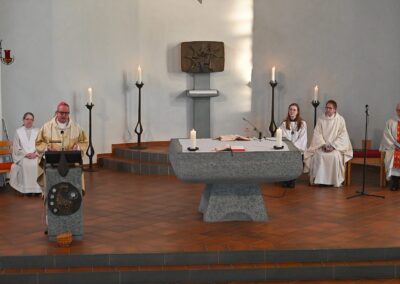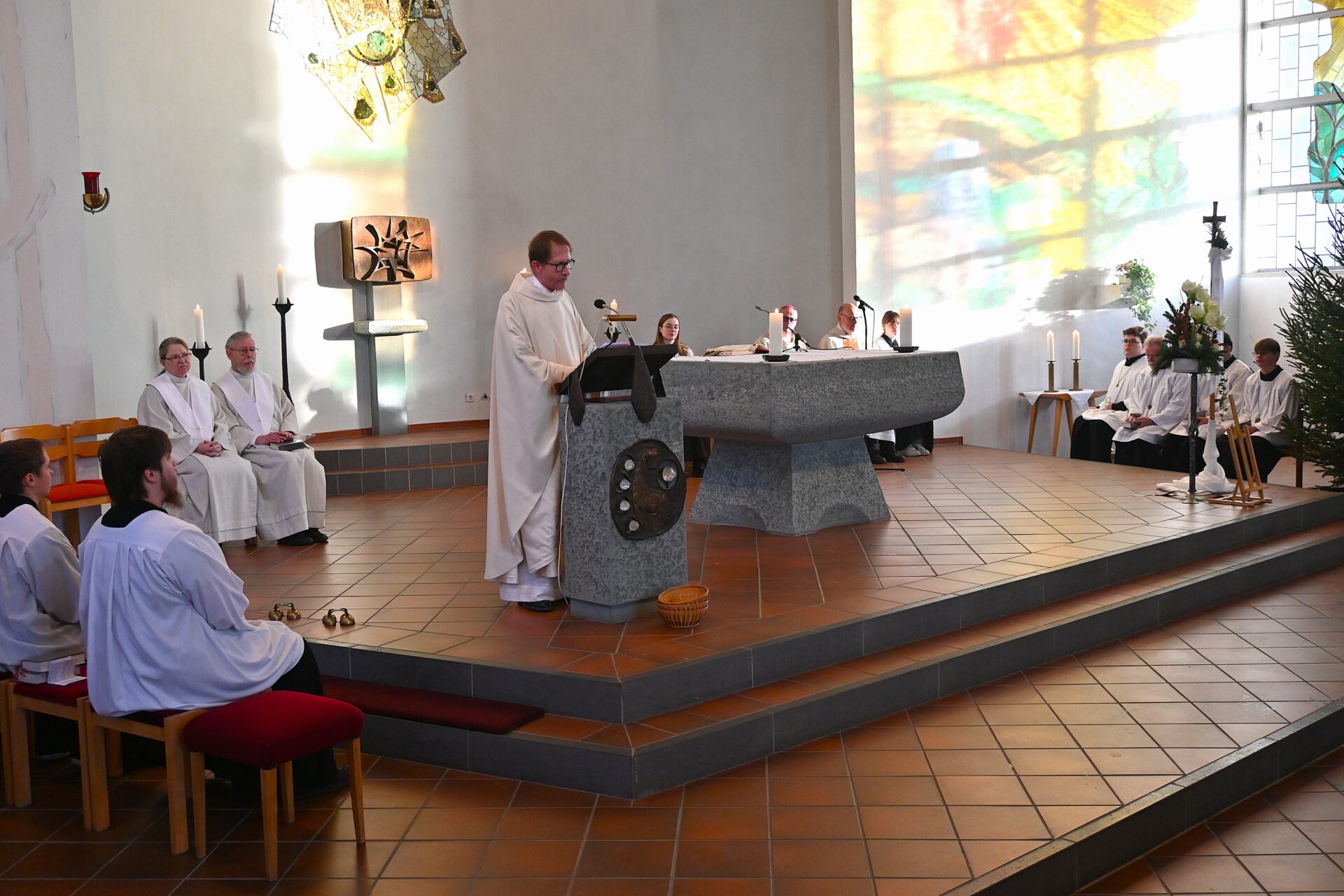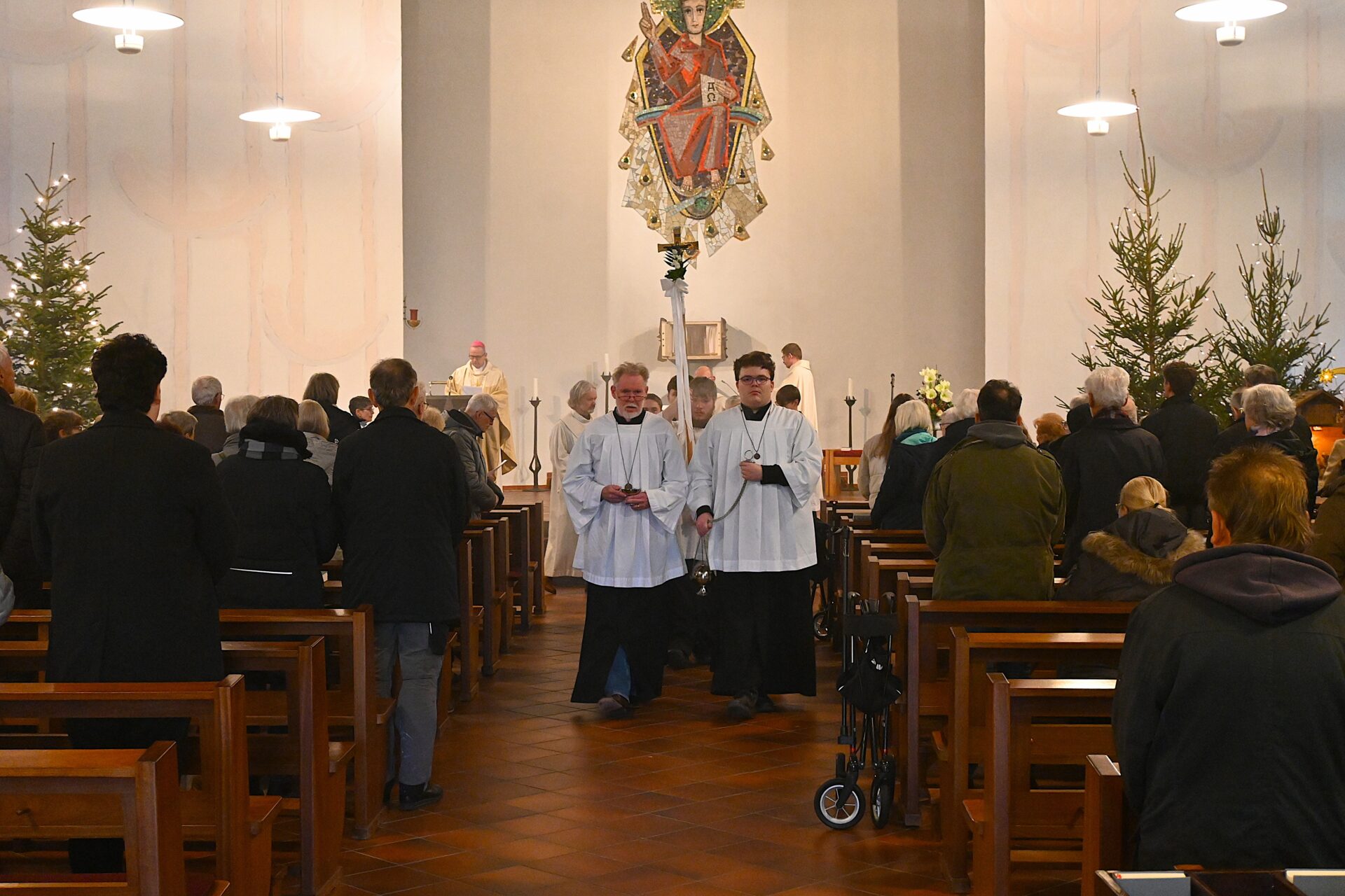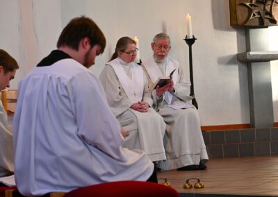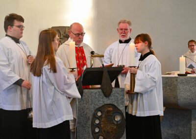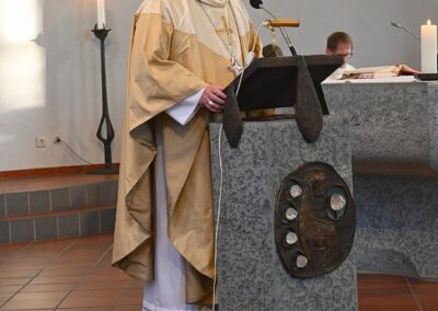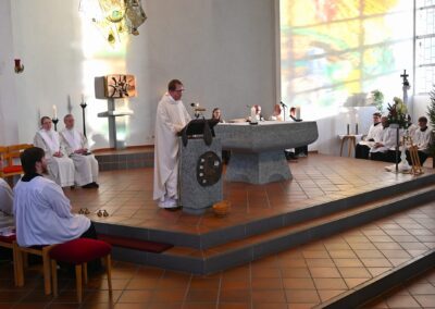 Pastor Christian Laubhold und Pfarrer Guido Bartels als Konzelebrant feierten den liturgischen Teil dieser Messe, die die fantastische Akustik des Kirchengebäudes an der Goethestraße voll zur Geltung brachte. Kirchenmusiker Andreas Feilen musste zwischendurch vom Dirigat vor dem Altar immer wieder zur Empore hinauf sprinten, wo er die Messe an der großen Seiffert-Orgel mit ganzem Einsatz begleitete.