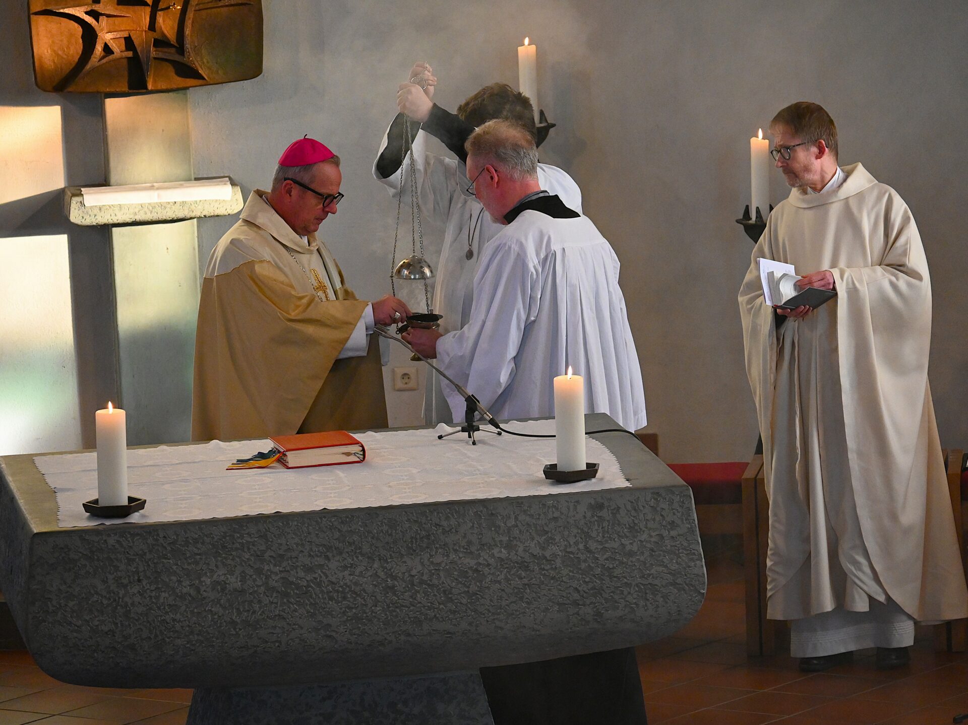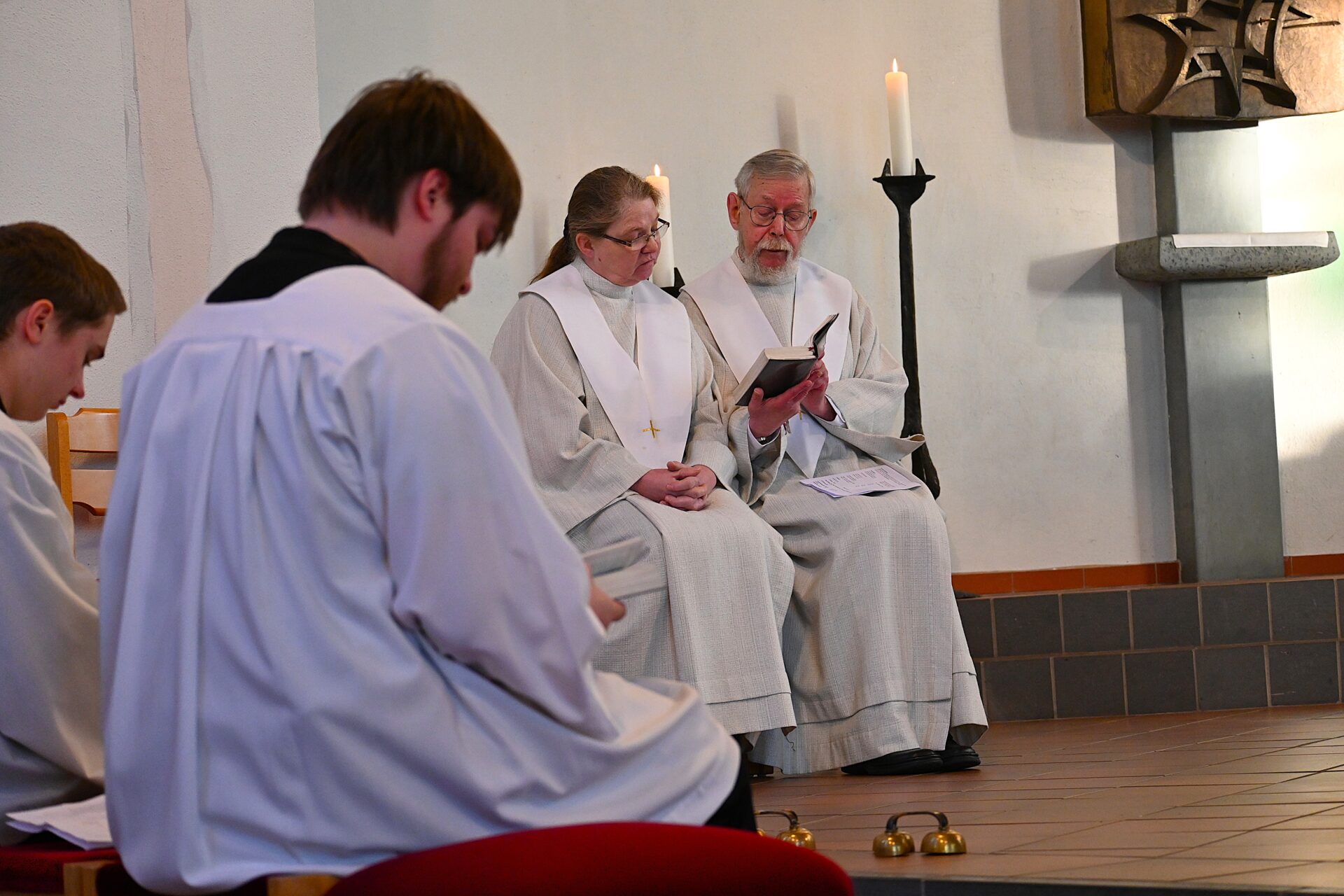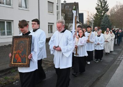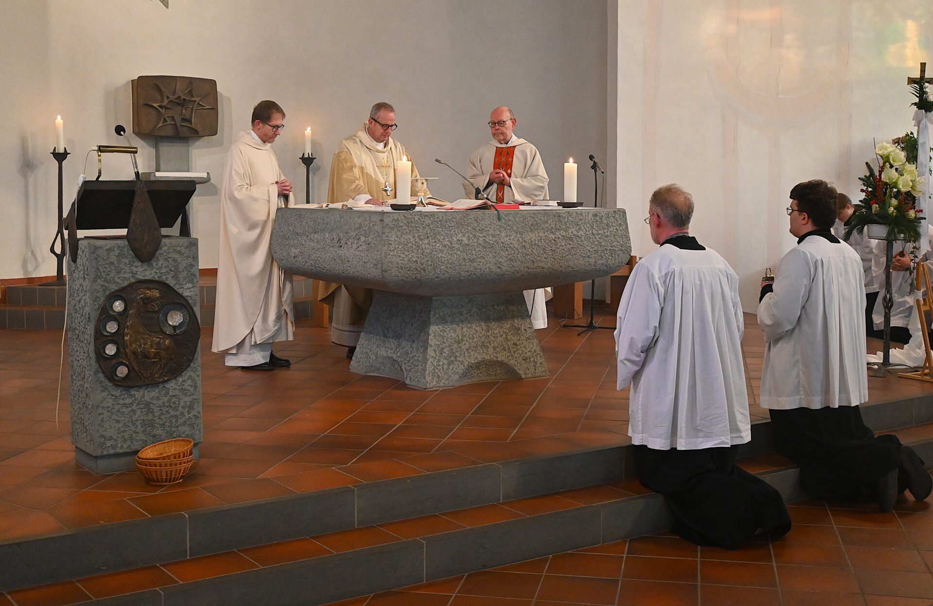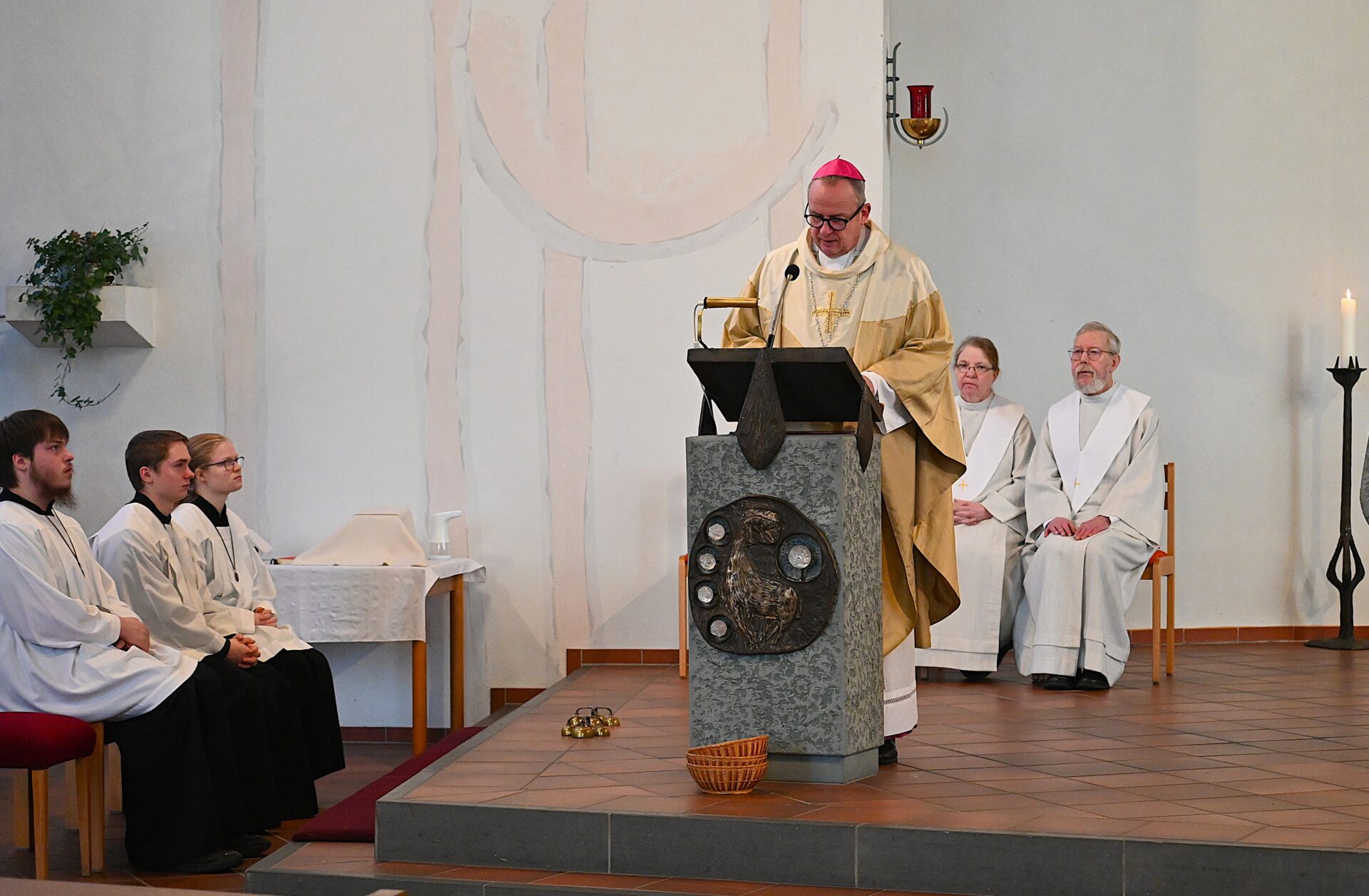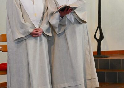 Pastor Christian Laubhold und Pfarrer Guido Bartels als Konzelebrant feierten den liturgischen Teil dieser Messe, die die fantastische Akustik des Kirchengebäudes an der Goethestraße voll zur Geltung brachte. Kirchenmusiker Andreas Feilen musste zwischendurch vom Dirigat vor dem Altar immer wieder zur Empore hinauf sprinten, wo er die Messe an der großen Seiffert-Orgel mit ganzem Einsatz begleitete.