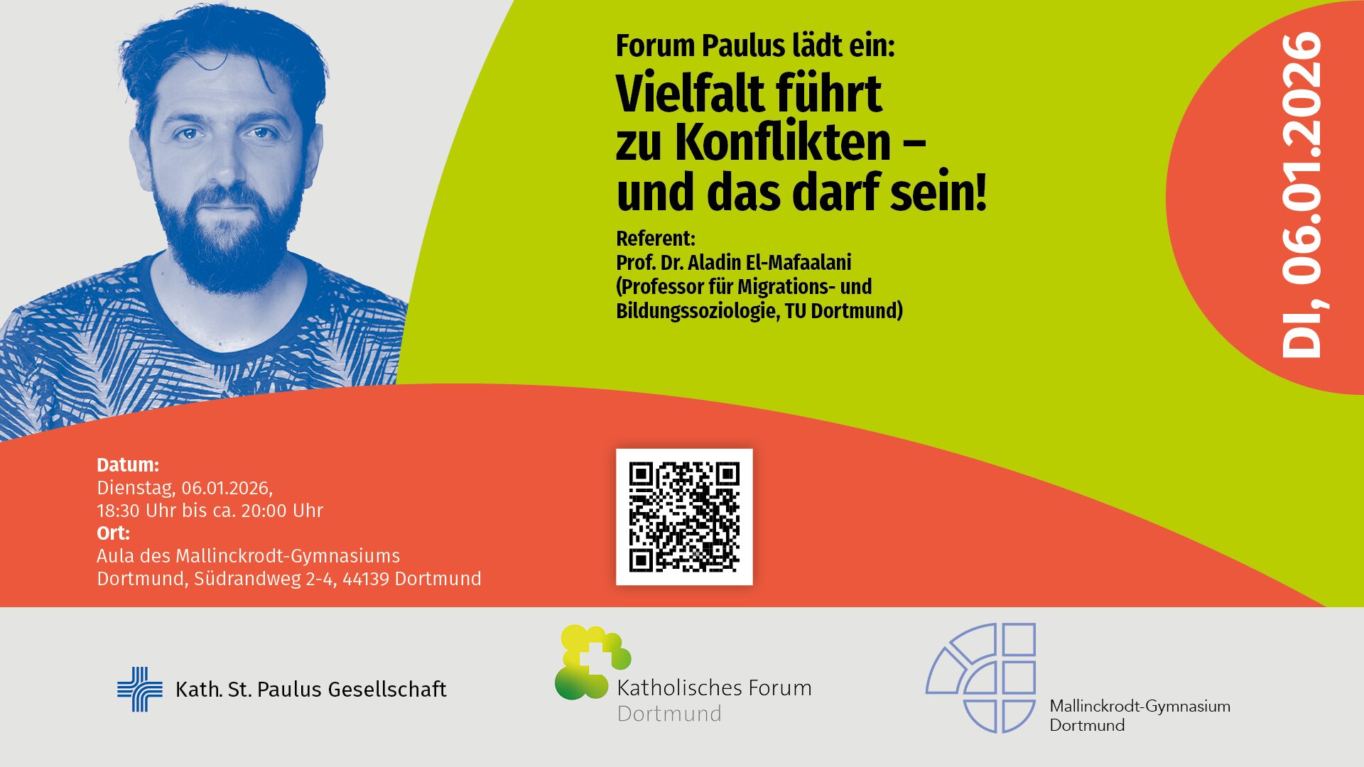 Das Forum Paulus lädt zum Vortrag „Vielfalt führt zu Konflikten – und das darf sein!“ ein. Am Dienstag, 6. Januar 2026, spricht Prof. Dr. Aladin El-Mafaalani, Professor für Migrations- und Bildungssoziologie an der TU Dortmund, über Vielfalt in unserer Gesellschaft und warum Konflikte dazugehören. Die Veranstaltung findet von 18:30 bis ca. 20:00 Uhr in der Aula des Mallinckrodt-Gymnasiums in Dortmund statt. Der Eintritt ist frei, alle Interessierten sind willkommen.
